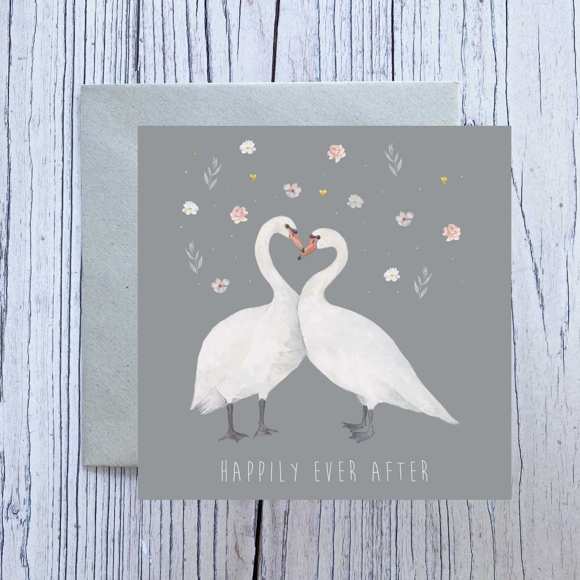 A beautiful illustration of two monogamous swans to celebrate someone’s wedding, with sprinklings of delicately painted flowers and leaves. This card has been hand finished with touches of gold ink (shown here with hearts and spots) so there will be slight variations and the gold ink is much more subtle than shown here.